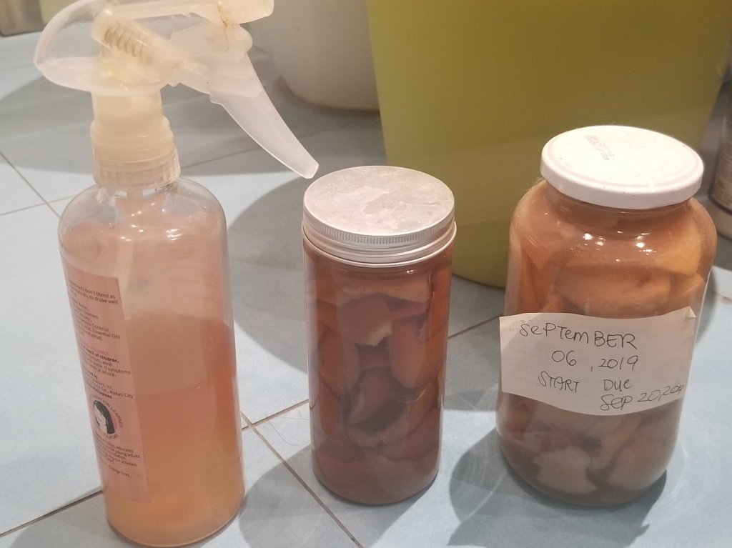 What you need are glass containers, citrus peels, vinegar (white, distilled, or coconut vinegar are some of the types that I have worked with) and spray bottles to contain the final cleaning liquid.